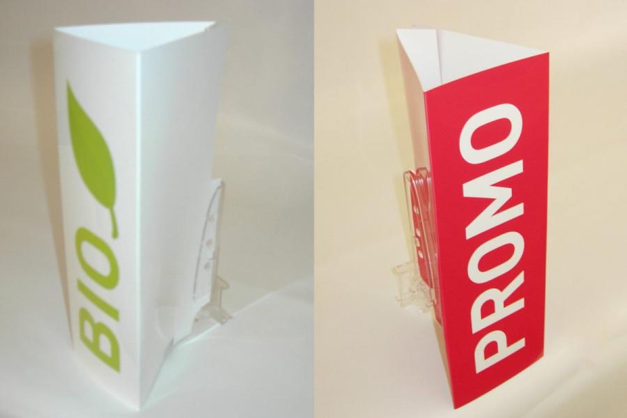 Associé à un système d’accroche par clip, il offre 3 faces visibles sur les linéaires de magasin. Soit de quoi capter encore plus l’attention des clients. Décliné dans toutes les formats et dans toutes les couleurs, le stop-rayon 3D, comme ses grands frères, est réalisé sur-mesure selon vos besoins.