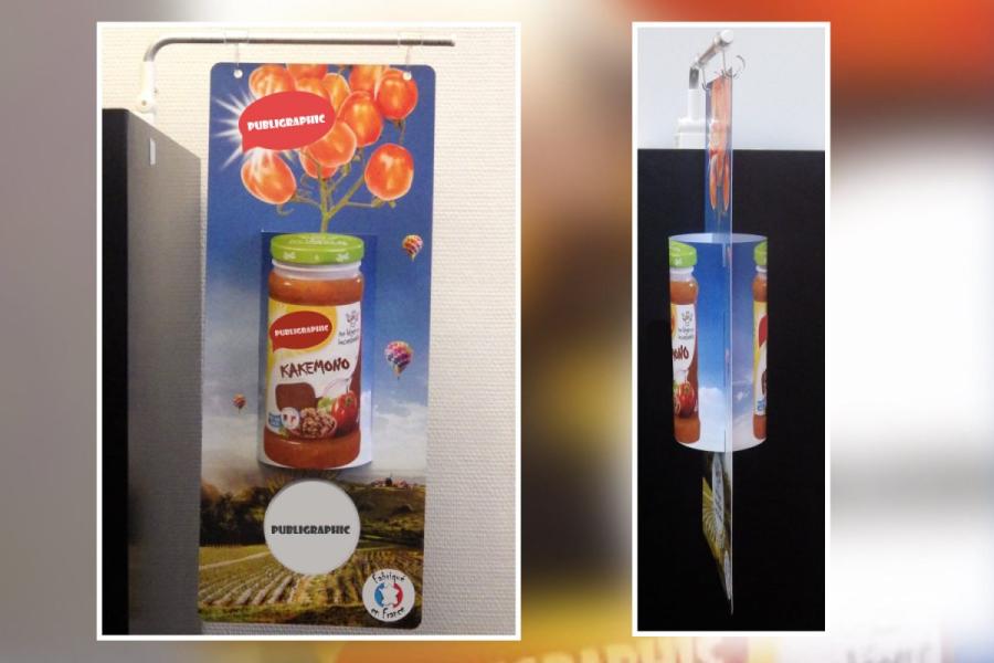 En prenant du relief, le kakemono 3D apporte une touche d’originalité qui le distingue du kakemono traditionnel. Toute forme peut être envisagée, notamment pour rappeler le conditionnement du produit : cylindre pour une conserve ou un bocal en verre, parallélépipède pour une boîte de biscuits,..