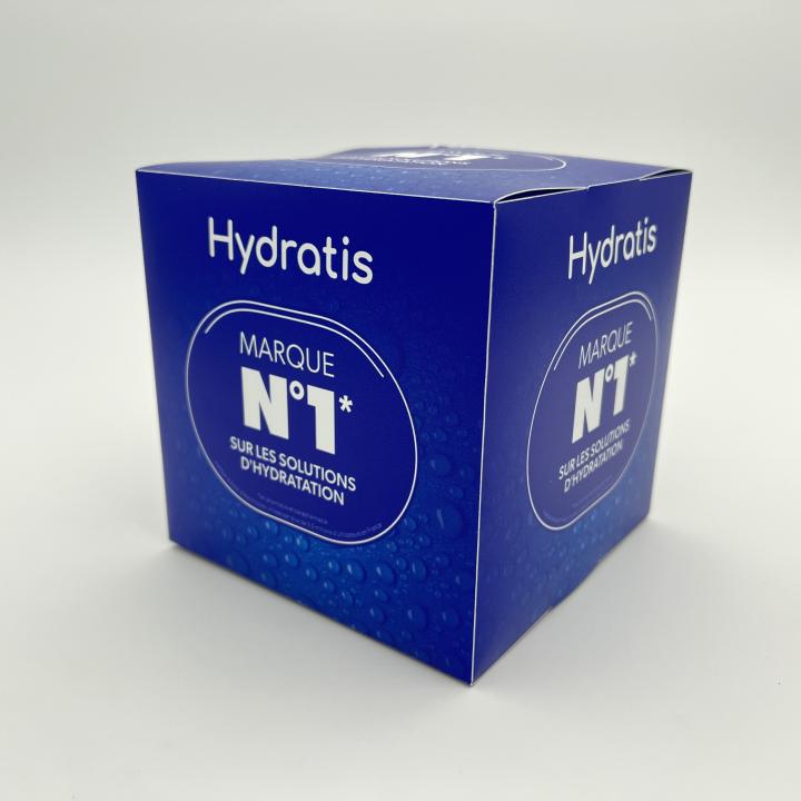 Le format cubique de 145 x 145 mm offre une surface d'affichage sur six faces, ce qui permet de diffuser le message de la marque quel que soit l'angle de lecture. Chaque face reprend l'identité visuelle d'Hydratis : fond bleu intense, typographie blanche claire et badge "Marque N°1" en format XXL pour un impact immédiat.