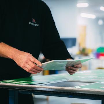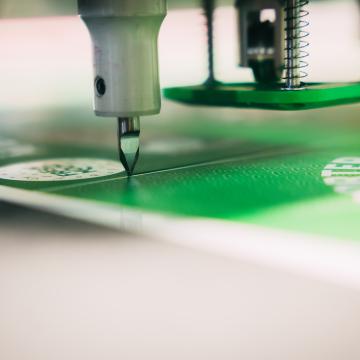 Nous imprimons en numérique ou en sérigraphie. Grâce à l’optimisation de vos formats, nous vous proposons un éco-devis pour limiter les chutes de production.